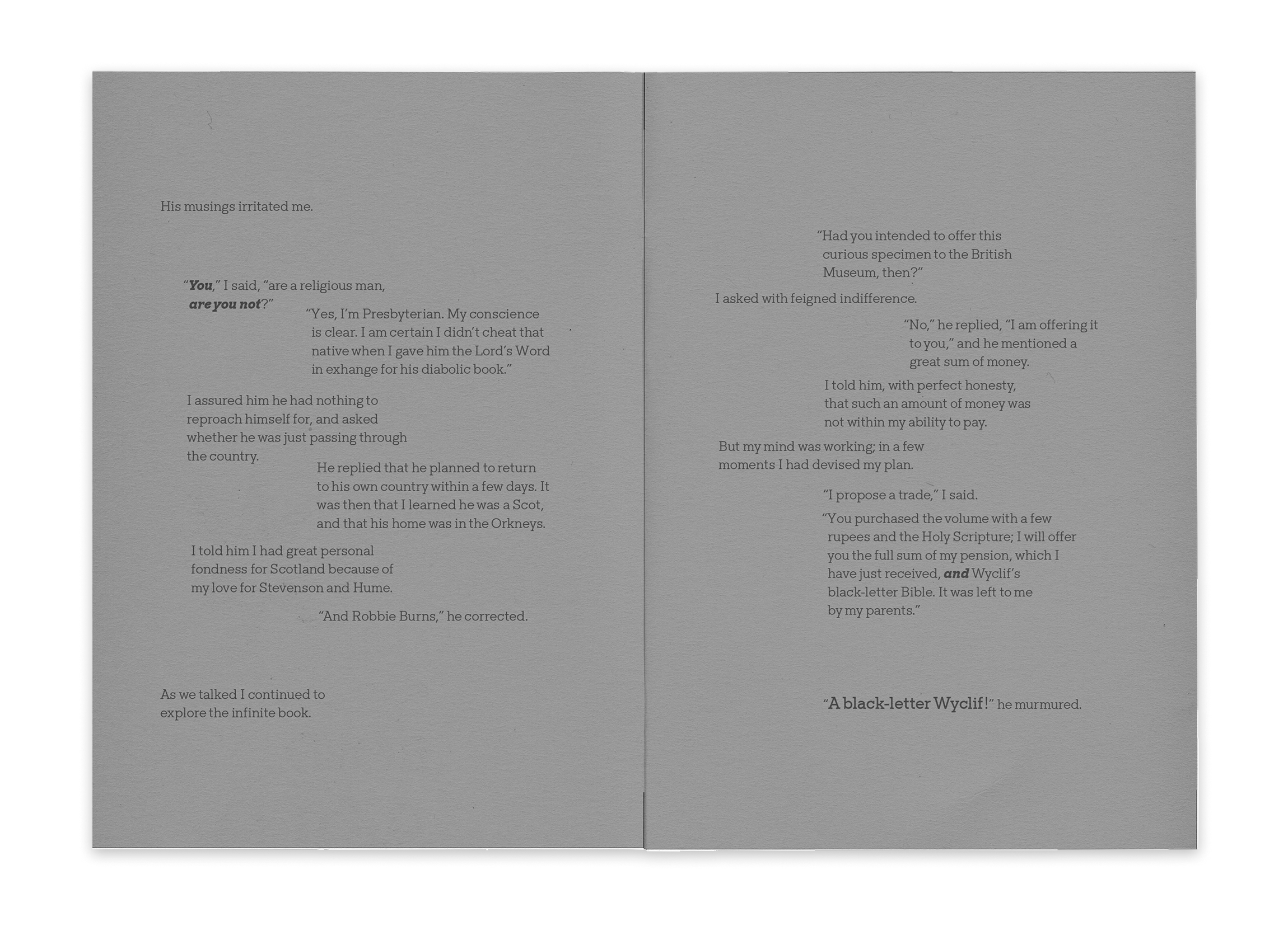 Using Jorge Luis Borges' short story The Book of Sand, I designed as well as binded a softcover book. I was inspired to utilize the emotional aspects of the story to design the book entirely through typography rather than explicit imagery.